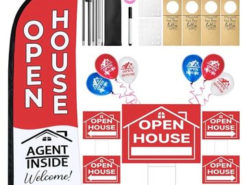 44 Pcs Open House Signs for Real Estate Agent Supplies, Double Sided Open House Flag with Poles Kit, 7.6 x 5.4 Ft Red Opening Sign Banner Set, 5 Pack Yard Signs with Metal Stakes 30 Balloons